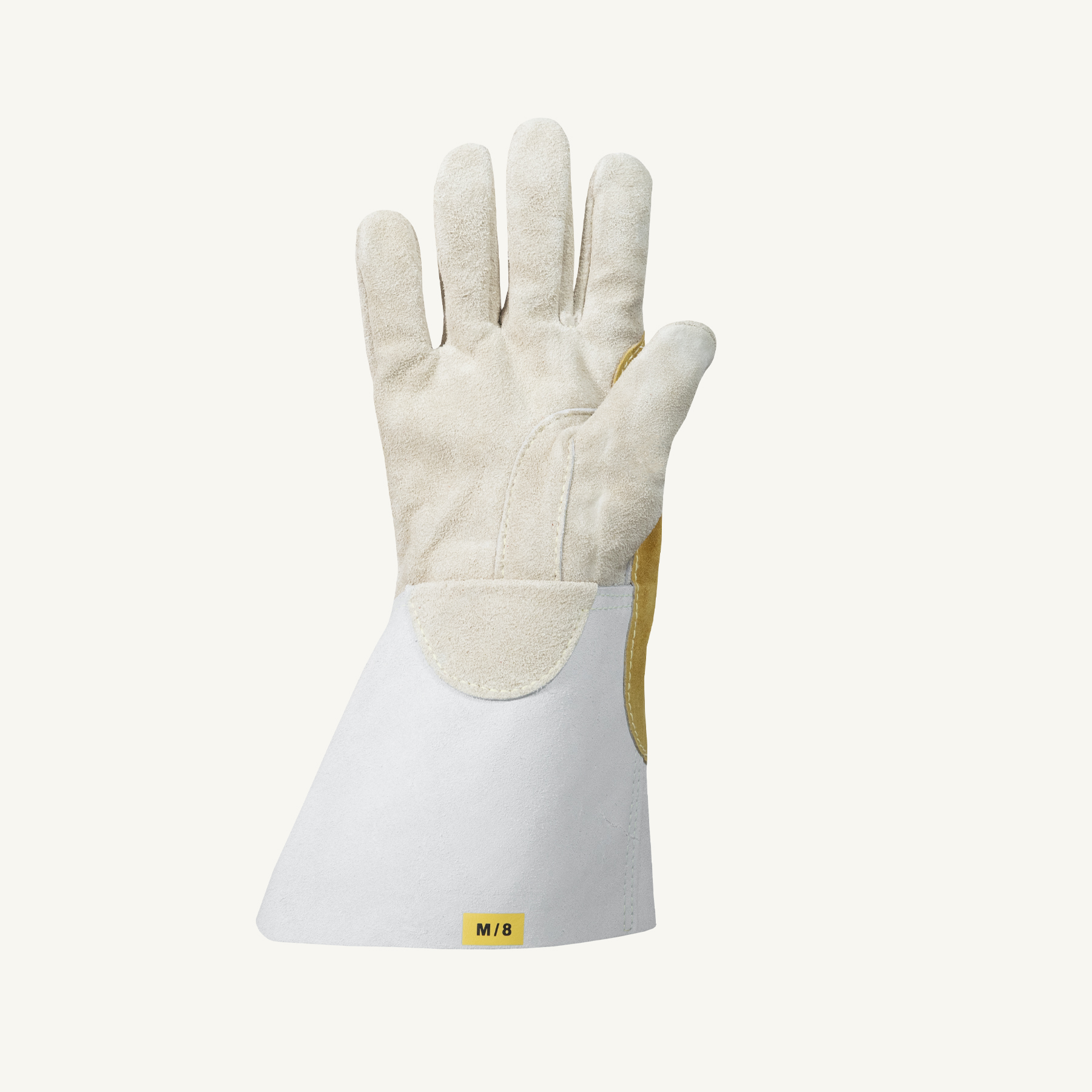 - Brand: Superior Glove™Color: GoldCuff Style: GauntletMaterial: Cow Grain LeatherPalm Material: Deer Skin LeatherResists: SparkSeries: 335CBP, Endura®Size: SStyle: Gunn Cut